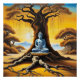 The A.I. created interpretation of a serene Buddha is depicted meditating under a large tree with extensive roots and branches. Golden hues dominate the surreal landscape, which features a mountainous backdrop and a setting or rising sun behind the Buddha.