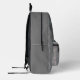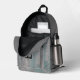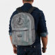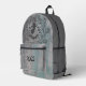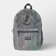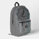 On this stylish backpack is a backdrop of chipped grey and blueish paint on rustic wood then decorative black floral wreath with a Buddha in the centre and on the front pocket is the word OM creating zen like vibes