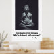 A grayscale photograph captures a serene Buddha statue seated in a meditative pose against a dark background. The statue is carved with intricate details, including a serene expression on the face, flowing robes, and a traditional headdress. The lighting casts subtle shadows on the statue, highlighting its form and creating a sense of tranquillity.