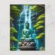 Tranquil buddha statue sitting next to a flowing waterfall.