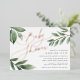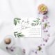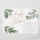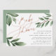 Simple and elegant baby shower invitation for modern moms-to-be features "baby shower" at the top left in chic rose gold foil script typography with soft green watercolor leaves and branches. Personalise with your baby shower details in grey lettering. A modern gender neutral baby shower invitation in a nature inspired colour palette.