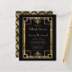 This elegant vintage-inspired wedding invitation features gold-coloured text on a black background, framed by a rectangular geometric vintage art deco design. A coordinating gold and black art deco fan pattern decorates the back of the card.
