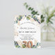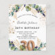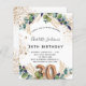 For a 30th birthday party. A white background decorated with eucalyptus greenery and golden leaves. Golden faux glitter spots. Personalize and add your names and wedding details. Black and golden colored letters. Number 30 is written with balloon style font.