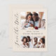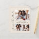 This simple, minimalist Save the Date card features a photo collage, with a horizontal photo at the top and two square photos at the bottom. The words "Save the Date" run vertically up the left margin in elegant black handwriting script. The couple's names, wedding date and city appear in between the photos in black sans serif font on a beige background. Add a more detailed message with additional information on the back, along with a QR code to help your guests visit your wedding website.