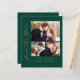 This simple, minimalist Save the Date card features a 3-photo collage, with a horizontal photo at the top and two square photos below. The words "Save the Date" run vertically up the left margin in elegant gold-coloured handwriting script. The couple's names, wedding date and city appear below the photo collage in sans serif font on an emerald green background. Add a more detailed message with additional information on the back, along with a QR code to help your guests visit your wedding website..