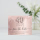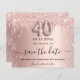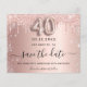 A girly and trendy Save the Date card for a 40th birthday party. Rose gold gradient background decorated with rose gold and faux silver glitter drips and dust. Personalize and add a date and name/text. The text: Save the Date is written with a large trendy hand lettered style script with swashes. Number 40 with a balloon style font.
