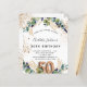 For a 50th birthday party. A white background decorated with eucalyptus greenery and golden leaves. Golden faux glitter spots. Personalise and add your names and wedding details. Black and golden coloured letters. Number 50 is written with balloon style font.