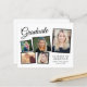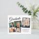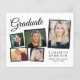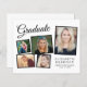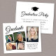Modern budget-friendly graduation party invitation featuring a 5 photo collage of scattered pictures in black frames, "Graduate" in an elegant script, the grad's name in classic serif typography, their school and class year in simple lettering, and your personalised party details on the back. This budget semi-gloss paper is similar in weight to photo paper. A larger 5x7 traditional card stock version is also available (message us for the link).