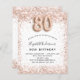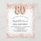 For an elegant 80th birthday. A white background. Decorated with rose gold, pink faux glitter, sparkles. Personalise and add a name, and party details. The name is written with a hand lettered style script, number 80 with balloon style fonts.