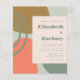 This modern design features abstract flowing shapes in shades of muted dark green, gold and orange on a pale sage green background. Personalise it with the names of the bride and groom in chunky typography and the wedding details in dark green text on a pale blush rectangle.