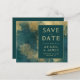 This elegant wedding Save the Date card features a modern teal blue and gold abstract watercolor background. Customise the gold-coloured text in stylish fonts on a dark teal rectangle, and add your wedding website URL to the solid teal back.