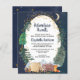 Budget-friendly rustic baby shower by mail invitation featuring a cute illustration of woodland animals with their tent camping in the mountains and forest, an overlay of gold stars and moon in a nighttime sky and "Adventure Awaits" and the mother-to-be's name in a dark midnight blue script. Easily personalise the shower by mail details.