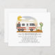 Adventure themed neutral unisex baby shower with illustration of yellow and vintage motorhome rv with baby clothes hanging on clothesline connected to cactus a desert sunrise sky with sun and clouds. text says "the adventure begins"