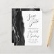 The left-hand edge of this elegant modern wedding save the date card features a black watercolor agate border trimmed with faux silver glitter. The customisable text combines charcoal grey handwriting, copperplate and italic fonts on a white background. The reverse side features a matching black and silver agate design.