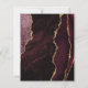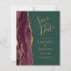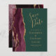 The left-hand edge of this elegant modern wedding save the date card features a burgundy watercolor agate border trimmed with faux gold glitter. The customizable text combines gold-colored handwriting, copperplate and italic fonts on a dark emerald green background. The reverse side features a matching burgundy and gold agate design.