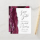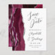 The left-hand edge of this elegant modern wedding save the date card features a burgundy red watercolor agate border trimmed with faux silver glitter. The customisable text combines charcoal grey handwriting, copperplate and italic fonts on a white background. The reverse side features a matching burgundy and silver agate design.