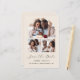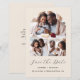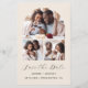 This simple, minimalist Save the Date card features a photo collage arch, with a horizontal photo at the top and two square photos below. The words "Save the Date" appear in elegant black handwriting script, followed by the couple's names, wedding date and city in sans serif font on a beige background. Add a more detailed message with additional information on the back.