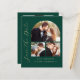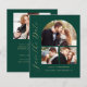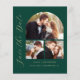This simple, minimalist Save the Date card features a photo collage arch, with a horizontal photo at the top and two square photos below. The words "Save the Date" run vertically up the left margin in elegant gold-coloured handwriting script. The couple's names, wedding date and city appear below the photo collage in sans serif font on an emerald green background. Add a fourth, horizontal photo and amore detailed message with additional information on the back.