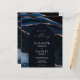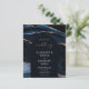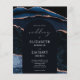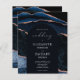 This modern design features a dark blue arch shape on a background of navy blue watercolor agate trimmed with rose gold faux glitter. The word "wedding" appears in elegant white script. Personalise the invitation with the names of the bride and groom in a combination of serif and sans serif typography and the wedding details in italics.