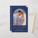This simple, minimalist Save the Date card features an arch-shaped vertical photo above the words "Save the Date" in elegant white handwriting script, followed by the couple's names, wedding date and city in sans serif font on a navy blue background. Add a more detailed message with additional information on the back.