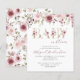 This sweet baby shower invitation features a top border of burgundy and blush pink watercolor flowers. Below, the words "baby in bloom" appear in gold letters adorned with burgundy and blush bouquets, with the words "in bloom" in elegant burgundy handwriting script below. Personalise the text with the name of the mum-to-be in burgundy script and the details in charcoal grey sans serif font on a white background. A coordinating burgundy and blush floral pattern decorates the back of the card.