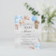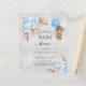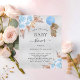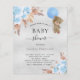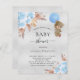 For a modern boho style baby shower. A faux silver looking background. Decorated with light blue roses, pampas grass and a teddy bear boy holding a blue balloon. Personalise and add a name and party details.