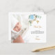 A modern and elegant baptism thank you card. A chic white background decorated with a watercolored light blue floral, eucalyptus greenery and faux gold leaves. Personalise and add your photo of the child, thank you note and name.