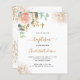 A white background decorated with eucalyptus greenery, a rose gold and blush pink rose, and golden leaves and faux gold glitter drops. Personalise and the childs name and ceremony details. Black and golden coloured letters.