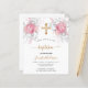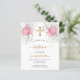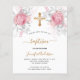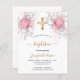 For an elegant baptism, celebrating a baby girl. A chic white background. Decorated with pink and white florals, roses and a faux gold cross. Personalise and add the name of the child and details. Black and golden letters.