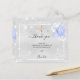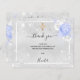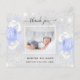 A simple and elegant thank you card with photo. A faux silver metallic looking background, a white frame, faux glitter dust, blue roses, florals. A golden cross. Personalise and add a thank you note, photo of the baby boy and name. Black text.