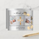 Add 2 or 3 of Your photos, vertical size, a date, name, and the thank you note. A faux silver looking background with black text and frame, a golden eucalyptus sprig. The text: Thank you on the front and your name on the back are written with a stylish hand lettered script with swashes.