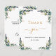 A thank you card for a 50th (or any age) birthday. A chic white background decorated with eucalyptus greenery. On front large hand lettered script and the text: Thank You, your text, title and a date. Golden and black coloured text.
