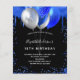A girly and feminine 18th (or any age) birthday party invitation. On front: A chic black background. Decorated with royal blue faux glitter drips, paint dripping look and balloons. Personalise and add a name and party details. The name is written with a hand lettered style script.