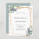 A stylish white background on the front. Decorated with eucalyptus and lavender florals. A faux gold geometric frame. Personalise and add a name and details.