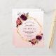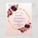 On front: An invitation for a 40th (or any age) birthday party. An elegant and trendy rose gold, white gradient background with a faux gold geometric frame. Decorated with dark purple and burgundy flowers, roses and boho style feathers. Templates for a name and party details. The name is written with a hand lettered style script, purple coloured letters.