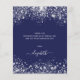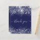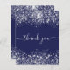 A navy blue background colour. Decorated with faux silver glitter dust. On front large white hand lettered script and the text: Thank You.