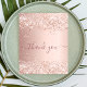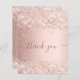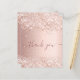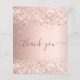 A feminine and elegant birthday thank you card. A rose gold, pink faux metallic looking background colour. With faux glitter dust. On front large dark rose gold coloured hand lettered script and the text: Thank You.