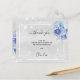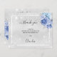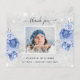 A simple and elegant sympathy thank you card with photo. A faux silver metallic looking background, a white frame, faux glitter dust, blue roses, florals. Personalise and add your thank you note. Black text.