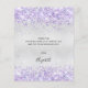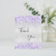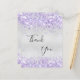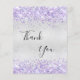 A feminine and elegant birthday thank you card. A faux silver metallic looking background colour. With purple, violet faux glitter dust. On front large hand lettered script and the text: Thank You.