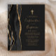 The left-hand edge of this elegant modern Confirmation invitation features a black watercolor agate border trimmed with faux gold glitter. A faux gold foil cross appears above the customisable text, which combines gold-coloured handwriting, copperplate and italic fonts on a slate black background. The reverse side features a matching black and gold agate design.