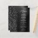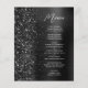 This elegant modern wedding menu features a faux diamond glitter border on a black faux brushed metal background. The customizable text combines white handwriting script and sans serif fonts. The black brushed metal and glitter design is repeated on the reverse side.