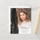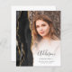 This trendy 2025 graduation announcement features a black watercolor agate geode border with faux gold glitter highlights. The graduate's first name appears as an elegant charcoal grey handwriting script overlay on a vertical photo, along with the last name, school and class year in copperplate font. A white gradient filter helps the text pop. A second, horizontal photo appears on the back, along with the announcement and details in charcoal grey text on a white background.