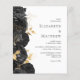 This romantic floral wedding invitation features a border of black flowers set off with gold faux foil foliage. The names of the couple appear in classic charcoal grey serif font, with the remaining text in italics.