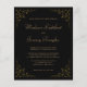 This elegant vintage-inspired formal wedding invitation features the text in gold-coloured script and serif fonts on a black background, framed by a delicate vintage gold vine motif. The frame is repeated on the reverse.