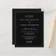 This simple, minimalist modern wedding invitation features classic white serif font on a black background, with selected words and phrases in stylish handwriting calligraphy. A thin white line provides a rectangular frame for the text. On the back, add your wedding details and a QR code your guests can scan to visit your wedding website. NOTE: Envelopes are not automatically included with these budget invitations, so please remember to choose the "white envelopes" option!