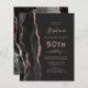 The left-hand edge of this elegant modern 50th birthday party invitation features a black watercolor agate border trimmed with rose gold faux glitter. The customisable text combines rose-coloured handwriting, copperplate and italic fonts on a slate black background. The reverse side features a matching black and rose gold agate design.