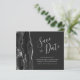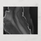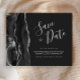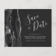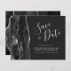 This elegant modern save the date card features a black watercolor agate border trimmed with faux silver glitter. The customisable text combines handwriting script, copperplate and italic fonts in silver grey on an off-black background. The back features a matching black and silver agate design.