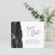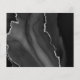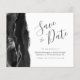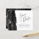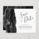 This elegant modern save the date card features a black watercolor agate border trimmed with faux silver glitter. The customisable text combines handwriting script, copperplate and italic fonts in charcoal grey on a white background. The back features a matching black and silver agate design.
