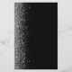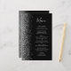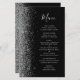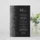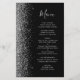 The left-hand edge of this elegant modern wedding menu features a silver faux glitter border. The customisable text combines silver grey handwriting script and copperplate fonts on a black background. The reverse side features a matching black and silver glitter design.