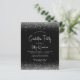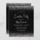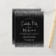 This simple, elegant graduation party invitation features a top and bottom border of silver faux glitter on a black background. The word "Graduation" and the name of the graduate appear in decorative modern handwriting font. Customise the invitation with party details in white sans serif font on a black background. A matching black and silver glitter design appears on the reverse side.